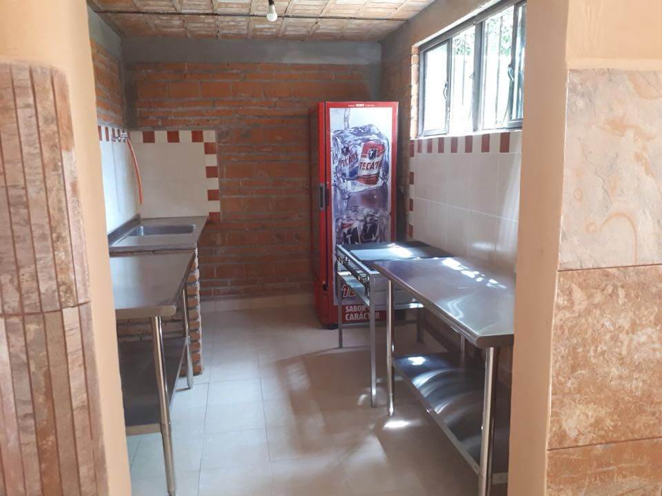 Cocina con refrigerador, parrilla con gas y tarja