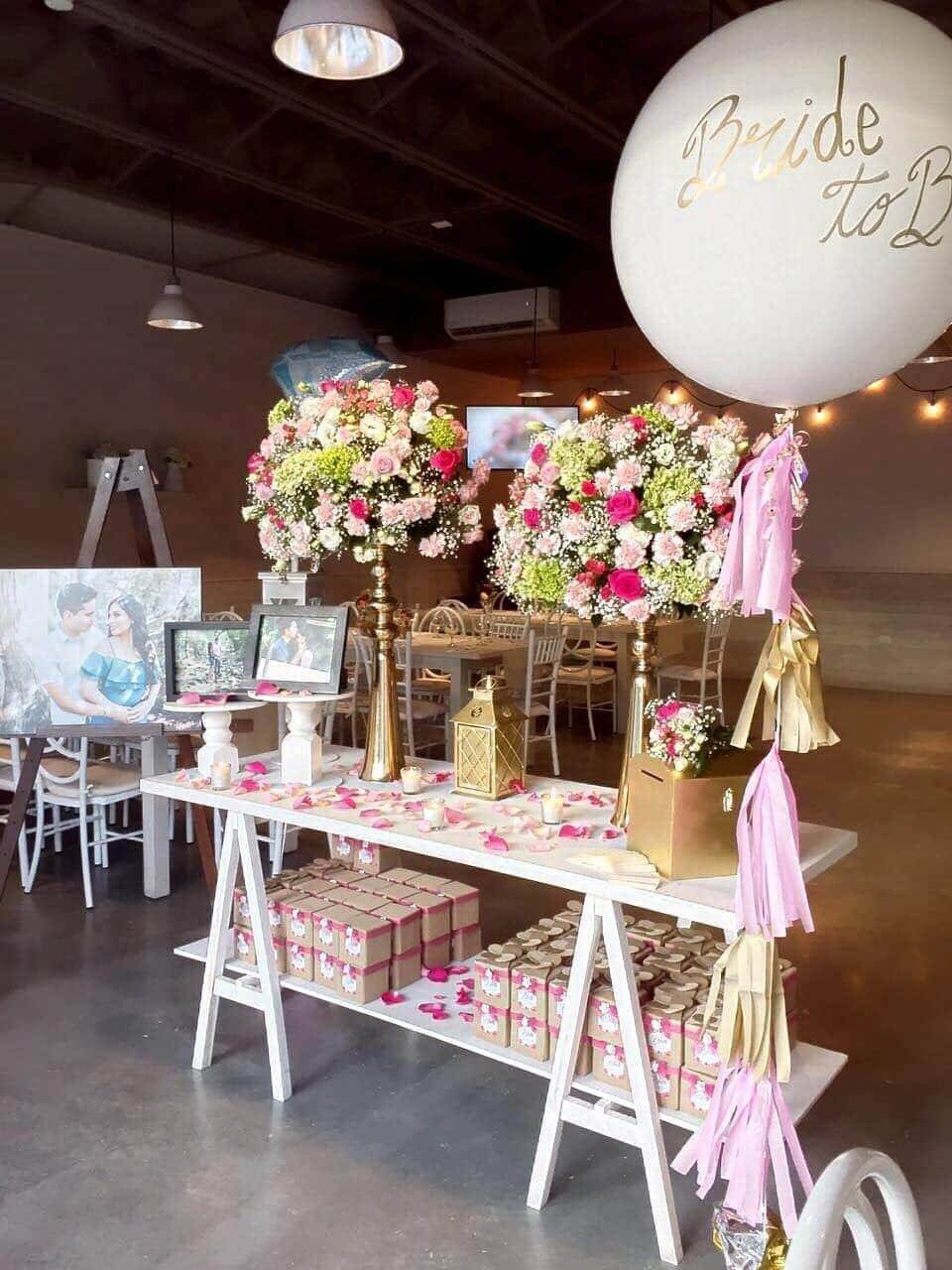 - Mesa de Ambientación (Con Buzón para sobres, Pizarrón de Madera personalizado para tu evento, Espacio para recuerditos, Arreglo floral de bienvenida a préstamo y portarretratos)