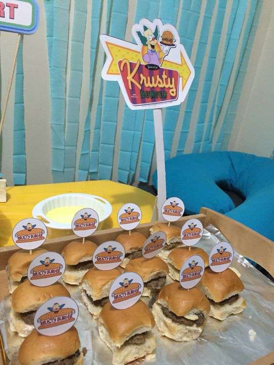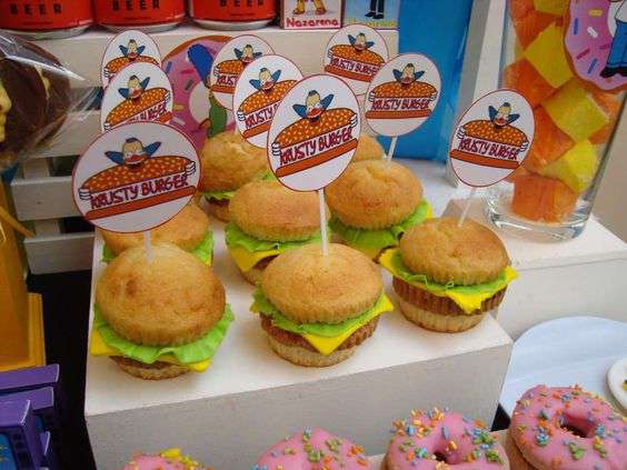 Hacer unas mini hamburguesas en tu mesa de dulce con el letrero clásico de la tienda de Krusty seria una idea grandiosa.