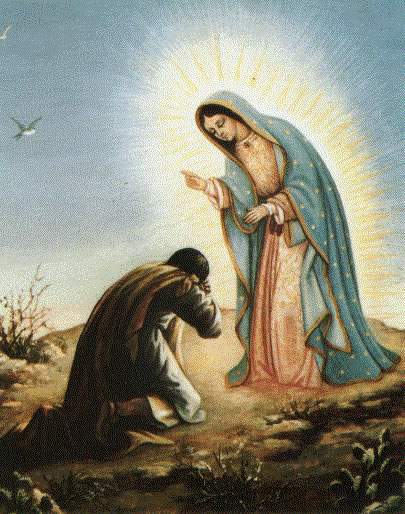 Un dia Juan Diego, una persona indigena del pueblo de Tlayacac, nacido y creado por la tribu chichimeca, iba como de costumbre caminando de donde actualmente vivia hacia el templo mas cercano donde el iba, para ello tenia que madrugar desde muy temprano na ves por semana. Cuando iba pasando por el monte de Tepeyac, escucho el canto del pájaro mexicano tzinitzcan anunciando la aparición de la Virgen de Guadalupe. La Virgen, le dijo a Juan Diego que fuera al templo, donde por el momento estaba el obispo Fray Juan de Zumagarra y le contara sobre la aparición. Sin duda Juan Diego fue hacia el templo y les contó a los padres que tenia que ver al obispo y contarles que se le ha aparecido la Virgen, Los padres no le creyeron y lo juzgaron de loco. Regreso Juan Diego al monte de Tepeyac y le dijo a la Virgen que no le han creído, por lo que la Virgen le volvió a decir que fuera a anunciar su aparición y sin dudarlo, Juan Diego al siguiente día fue nuevamente a decir lo que ha pasado.